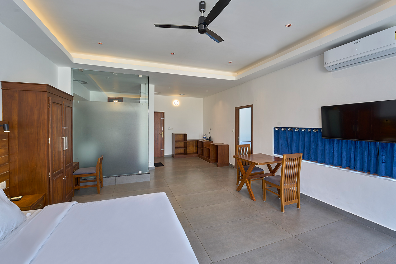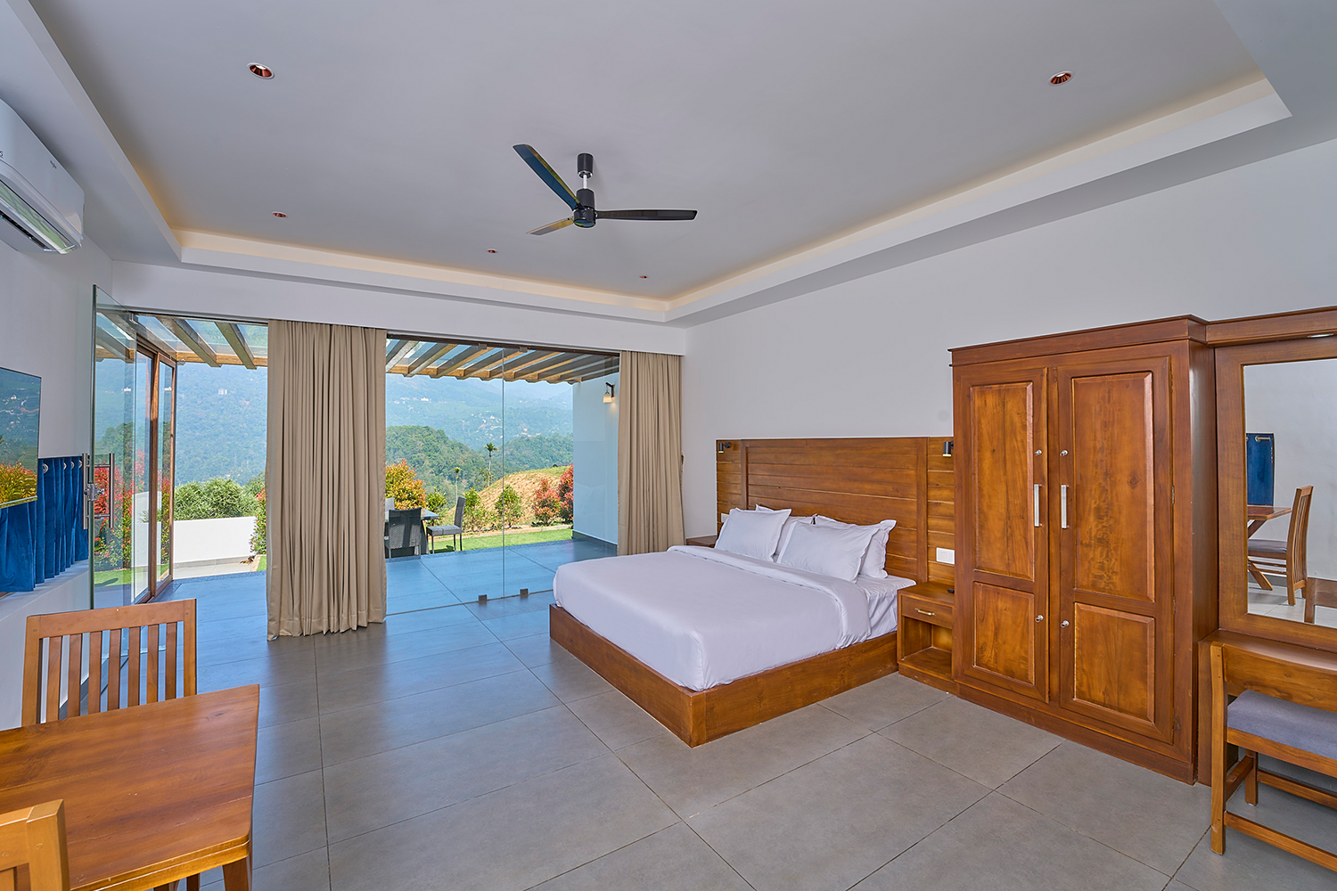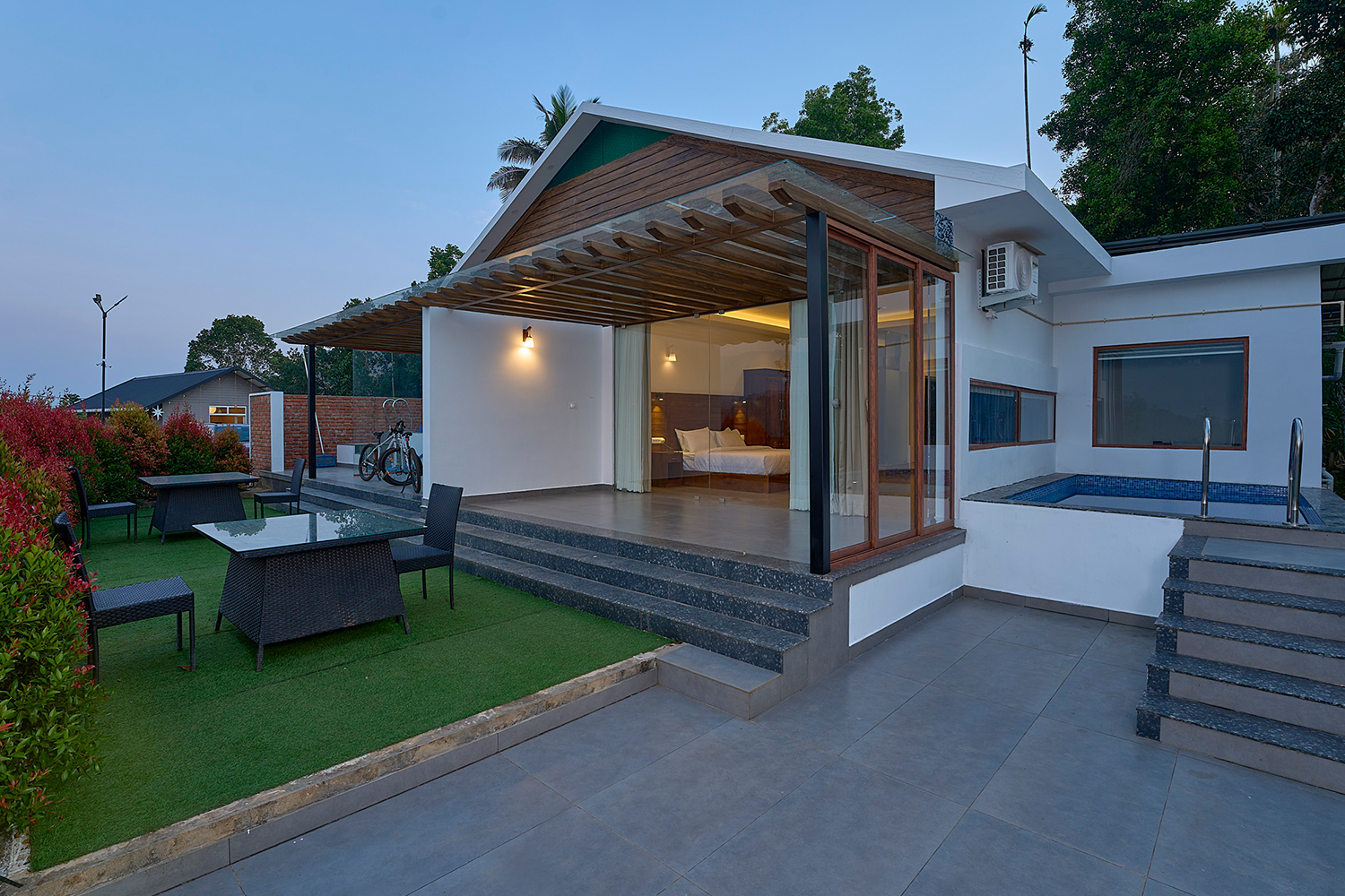 A generous layout for families or friends traveling together — two sleeping zones, a lounge area, and a private patio.